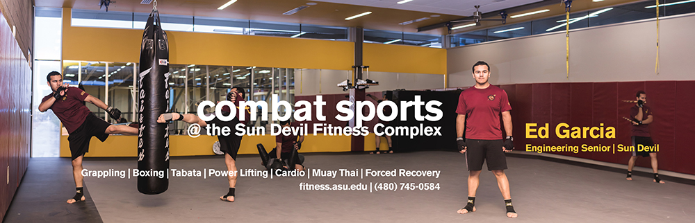 Part of the campaign also needed special focus on the specific classes provided. For Combat Sports, I spent some time talking to the student instructors, and was impressed with their abilities, so I figured it'd be compelling to capture them in action. Since the photo studio couldn't manage it, I shot these myself. I had them do multiple actions in multiple angles. Then I stitched the photos together into a banner. It was particularly challenging because we were very tight on time and our office only had the budget for a camera, but no lights.